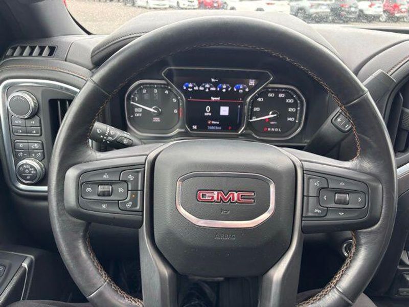 AT4 Preferred Package (Power Sliding Rear Window w/Rear Defogger, Premium Bose 7-Speaker Sound System, Radio: Premium GMC Infotainment Sys w/Navigation, SiriusXM Radio, Universal Home Remote, and Wireless Charging), AT4 Premium Package (Trailer Tire Pressure Monitor System), Driver Alert Package I (Lane Change Alert w/Side Blind Zone Alert, Rear Cross Traffic Alert, and Ultrasonic Front & Rear Park Assist), Driver Alert Package II (Following Distance Indicator, Forward Collision Alert, Front Pedestrian Braking, IntelliBeam Automatic High Beam On/Off, Lane Keep Assist w/Lane Departure Warning, Low Speed Forward Automatic Braking, and Safety Alert Seat), Preferred Equipment Group 4SB (12-Volt Rear Auxiliary Power Outlet, 120-Volt Bed Mounted Power Outlet, 120-Volt Instrument Panel Power Outlet, 170 Amp Alternator, 2 USB Ports, 2 USB Ports (1st Row), 4.2'' Diagonal Color Display Driver Info Center, All-Weather Floor Liner (LPO), Auxiliary External Transmission Oil Cooler, Body-Color Surround Grille, Color-Keyed Carpeting Floor Covering, Compass, Deep-Tinted Glass, Electric Rear-Window Defogger, Electrical Lock Control Steering Column, Floor Mounted Console, GMC 4G LTE, GMC Connected Access, HD Radio, HD Rear Vision Camera, Heated 2nd Row Outboard Seats, Heated Driver & Front Passenger Seating, Heavy-Duty Rear Locking Differential, High-Capacity Air Filter, Hill Descent Control, Hitch Guidance, Hitch Guidance w/Hitch View, In-Vehicle Trailering App, Integrated Trailer Brake Controller, Keyless Open & Start, LED Cargo Area Lighting, Manual Tilt-Wheel & Telescoping Steering Column, OnStar & GMC Connected Services Capable, Power Door Locks, Power Front Passenger Windows w/Express Up/Down, Power Front Windows w/Driver Express Up/Down, Power Rear Windows w/Express Down, Rear Dual USB Charging-Only Ports, Rear Wheelhouse Liners, Red Recovery Hooks, Remote Vehicle Starter System, Spray-On Pickup Bed Liner w/AT4 Logo, Steering Wheel Audio Controls, Theft Deterrent System (Unauthorized Entry), and Ventilated Driver & Front Passenger Seats), Technology Package (8'' Driver Information Center, Black Mirror Caps (LPO), HD Surround Vision, Multi-Color 15'' Diagonal Head-Up Display, and Rear Camera Mirror), Trailering Package, 10-Speed Automatic, 4WD, Jet Black With Kalahari Accents Leather, 10-Way Power Driver Seat Adjuster w/Lumbar, 10-Way Power Passenger Seat Adjuster w/Lumbar, 18'' x 8.5'' Machined Aluminum Wheels, 3.23 Rear Axle Ratio, 4-Wheel Disc Brakes, 6 Speakers, 6-Speaker Audio System Feature, 6'' Rectangular Black Tubular Assist Steps (LPO), ABS brakes, Air Conditioning, Alloy wheels, AM/FM radio: SiriusXM, Apple CarPlay/Android Auto, Auto-dimming door mirrors, Auto-dimming Rear-View mirror, Automatic temperature control, Brake assist, Bumpers: body-color, Delay-off headlights, Driver door bin, Driver Memory, Driver vanity mirror, Dual front impact airbags, Dual front side impact airbags, Electronic Stability Control, Front anti-roll bar, Front Bucket Seats, Front Center Armrest, Front dual zone A/C, Front fog lights, Front License Plate Kit, Front reading lights, Front wheel independent suspension, Fully automatic headlights, Heated door mirrors, Heated front seats, Heated rear seats, Heated steering wheel, Illuminated entry, Low tire pressure warning, Memory seat, Occupant sensing airbag, Off-Road Suspension, Outside temperature display, Overhead airbag, Overhead console, Panic alarm, Passenger door bin, Passenger vanity mirror, Perforated Leather-Appointed Seat Trim, Power door mirrors, Power driver seat, Power passenger seat, Power steering, Power Sunroof, Power windows, Premium audio system: GMC Infotainment System, Rad